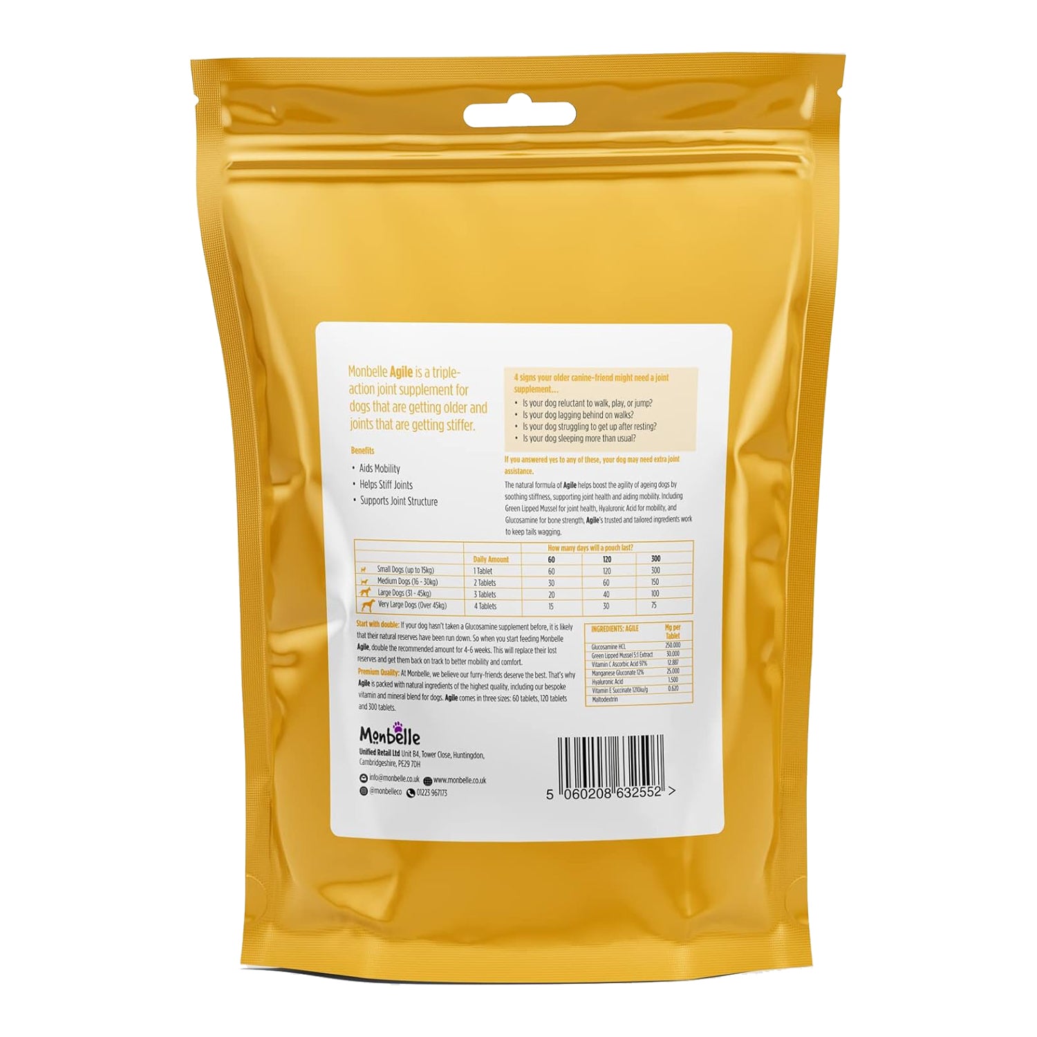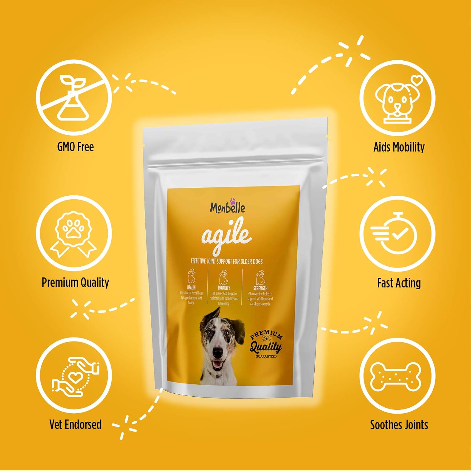 Monbelle Agile is a triple-action joint supplement for dogs that are getting older and joints that are getting stiffer.